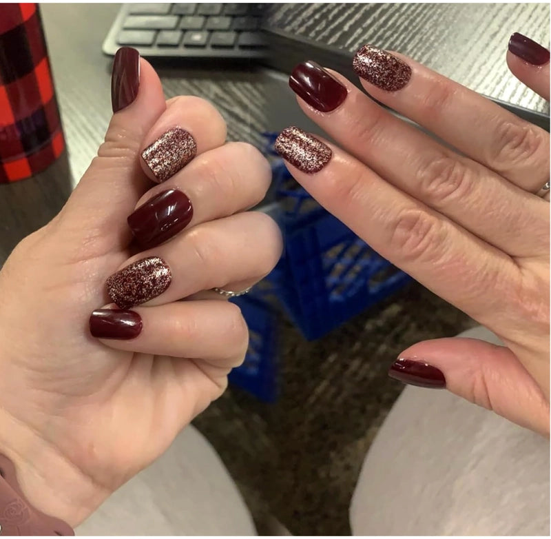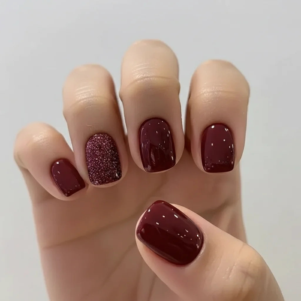 Deep burgundy with a hint of glitter – these nails aren't just an accessory, they're a statement. Feel instantly confident and put-together for any occasion.